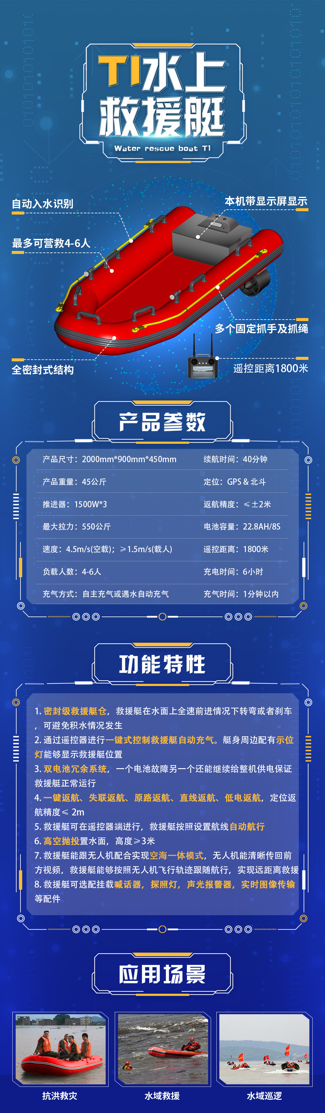 水上救援受地形、外環(huán)境變化的影響,救援難度也不一樣,比如,在寒冷天氣中的溺水救援。救援人員則可以通過拋投水上救援機器人,讓其立即出發(fā),在最短的時間內讓溺水人員抓住機器人,獲得呼吸的機會,并由機器人帶回岸上。又或者,為了應對雨季發(fā)生的洪災,使用水上救援艇,實施大規(guī)模救援,保障生命。