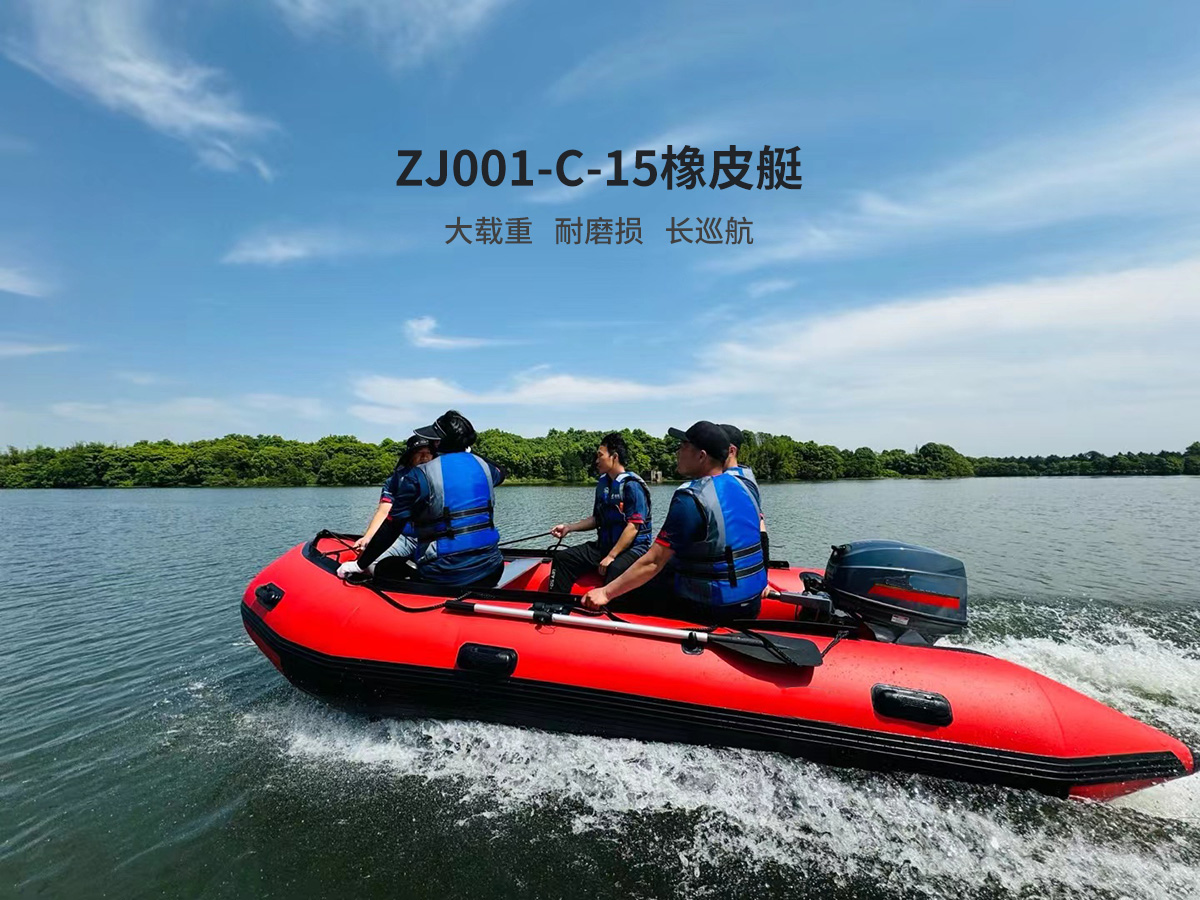 型號:ZJ001-C-15 尺寸:艇長430cm,艇寬195cm 氣囊直徑:50cm 翹首高度:70cm 氣室數(shù)量:5個 設計最大載員:9人 設計最大載重:1000kg 設計最大航速40km/h